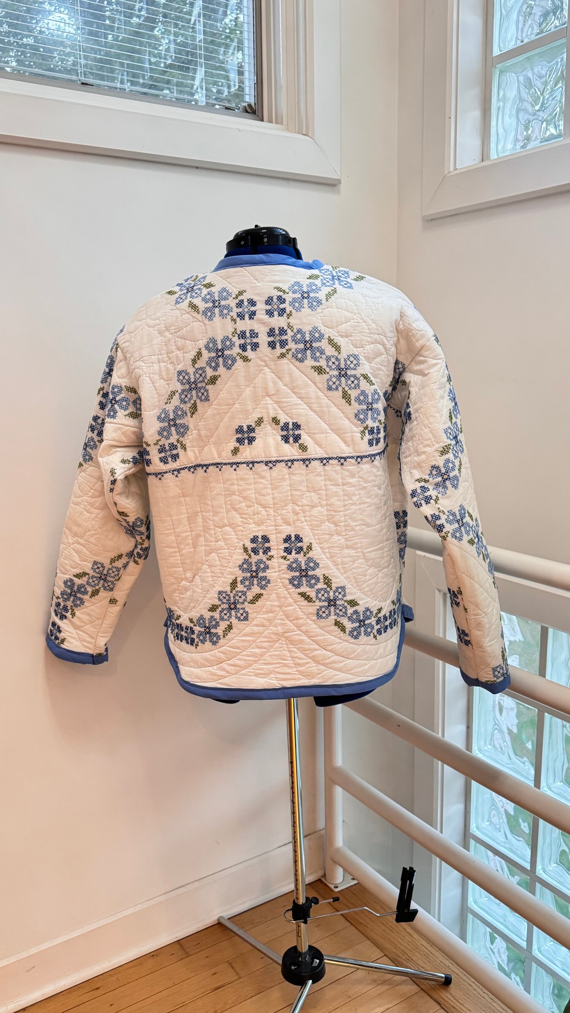 This beautiful white jacket with blue embroidered flowers is stylish without being overpowering. Would go great with Jeans or dress paints. This jacket has a zipper closure and is a more boxy fit. No pockets. Size Extra Large.